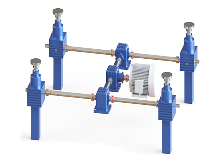 多臺聯(lián)動絲桿升降機平臺,電機在中間,電機連接轉(zhuǎn)向箱或者K系列減速機,在通過連接桿和···